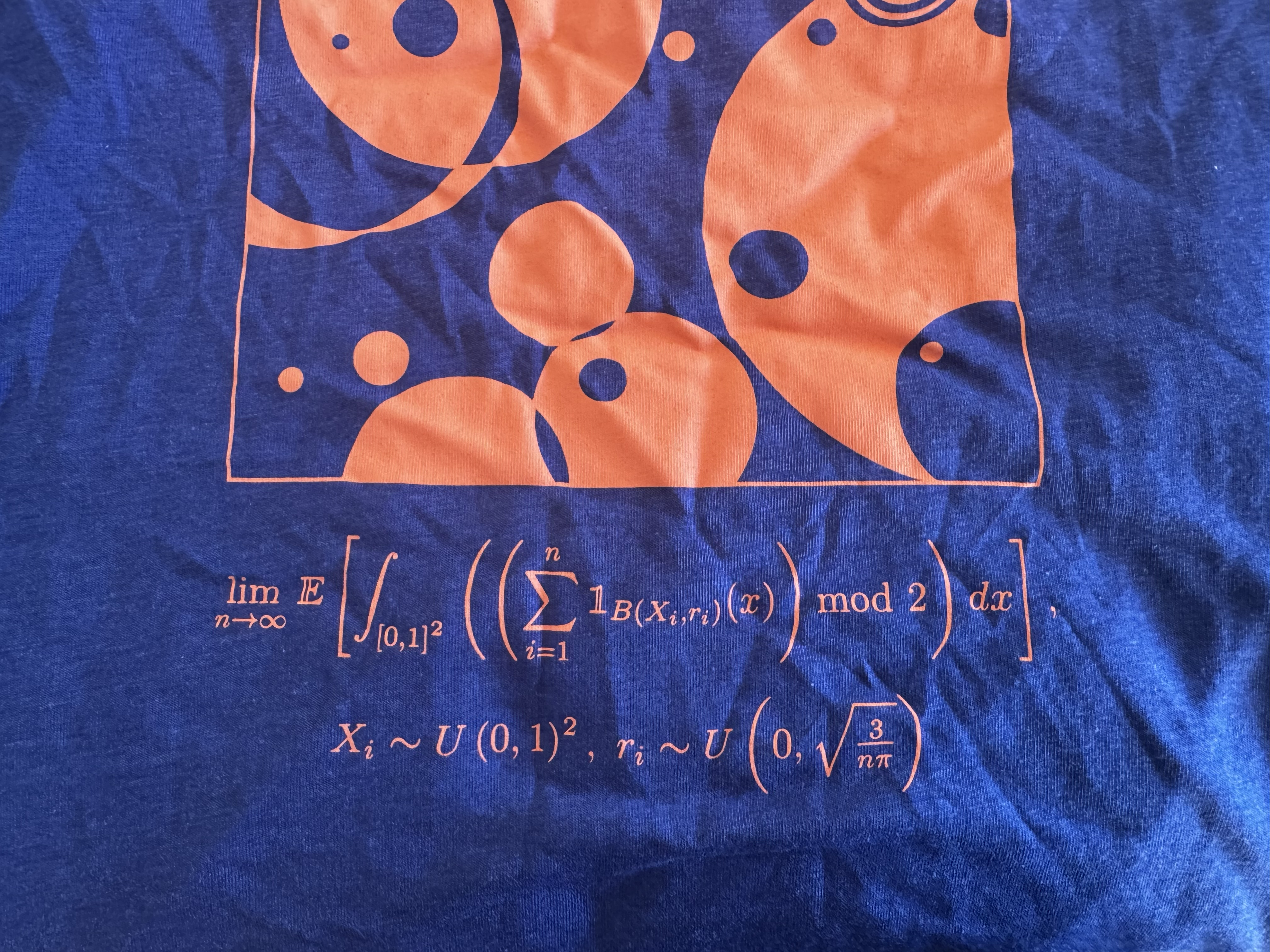 \[\lim_{n \to \infty} \mathbb{E}\Bigl[\int_{[0,1]^2}\Bigl(\Bigl(\sum\limits_{i=1}^{n} \mathbb{1}_{B(X_i, r_i)}(x) \Bigr)\text{mod } 2\Bigr)dx\Bigr]\] \[X_i \sim U(0,1)^2, r_i \sim U\Bigl(0, \sqrt{\frac{3}{n\pi}}\Bigr)\]Pretty nasty equation, at first glance!